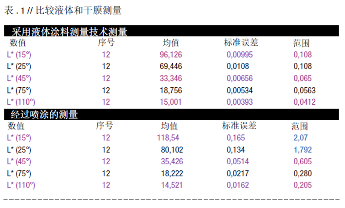表1顯示的是同一種金屬效果涂料,液體濕膜的顏色測(cè)量和干膜顏色測(cè)度,不同觀察角度的亮度值L*。其中干膜樣品是用同種涂料在噴涂室并使用用愛(ài)色麗MA系列進(jìn)行測(cè)量。