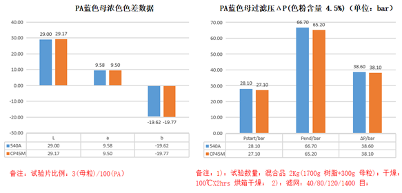 1、在PA6藍(lán)色色母粒里面,CP45M和540A過濾壓ΔP幾乎一樣,表明兩個(gè)產(chǎn)品在PA6藍(lán)色色母粒里面的分散性一樣。